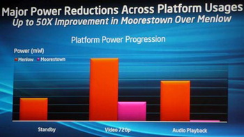 Concerning the latter special future, developers optimized the layout Of moorestown for the application in compact devices, especially in those, where the thickness is the determining factor. For example, in traditional PC the majority of controllers are located on the motherboard . In Moorestown on the contrary, the majority is integrated in the chip MSIC briertown . The improvements of moorestown platform allowed to decrease its physical sizes two times in comparison with the previous platform menlow. This tendency must be preserved, also, after transfer to the 32-nm platform medfield.