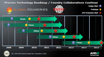 The first processors with bobcat architecture will be released on 40 nm technology by TSMC, and the processors llano and bulldozer generation will be released on 32 nm technology by globalfoundries company  . The illustration presented above note that the 32 nm processors models were released at the end of 2009, and the models of 40 nm  processors appeared a block later. However, series 40 nm processors AMD will appear on the market almost a half year earlier than 32 nm analog.