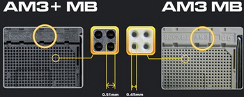 Outwardly new processor socket can be distinguished by the marking AM 3b or the larger openings  0,51 mm against 0,45 mm in AM3. According to the producer, this simplifies CPU installation and decreased the risk of damage .
