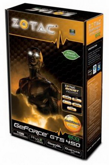 Zotac GTS 450 is equipped with ECO Edition single slot active cooler , 192-core CUDA, GPU / Shader frequencies 600/1200 MHz , memory interface equal to 128-bit , 1GB of DDR3 memory operating at a frequency equal to 1333, also the card support 2-Way SLI, and three display outputs - DVI, HDMI and DisplayPort.