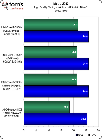 In gaming applications, the situation similar to 3DMark 11. The results of all processor are close to each other and limited by the performance of graphics accelerator, GeForce GTX 580: