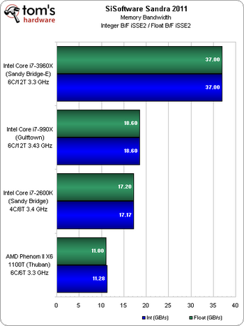 In Sandra 2011 we see the distinct advantage of Core i7-3960X over its predecessor . Especially the memory, demonstrating an increase in memory bandwidth by half in comparison with Core i7-990X :