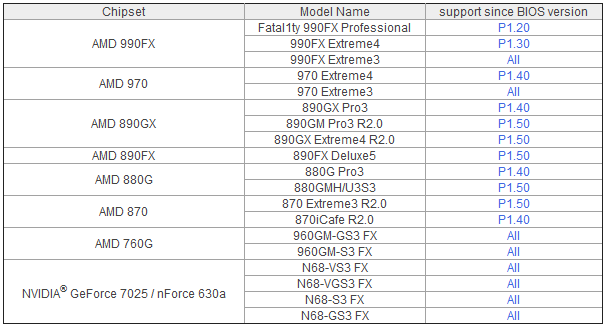 The list of motherboards, supporting AMD FX processors, announced by ASRock company are listed in this list: