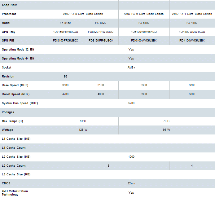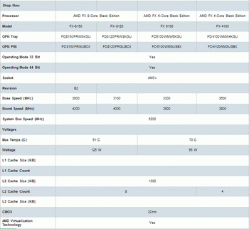 FX models with TDP level not more than 95 W are marked FD6100WMW6KGU and FD4100WMW4KGU, in the box version - FD6100WMGUSBX and FD4100WMGUSBX. For some reason, stepping B2 is mentioned only for the older processor FX-8150. For each model AMD indicate two frequency values - default and maximum with Turbo Core. Limiting temperature for models with TDP level not more than 125 watts is equal to 61 degrees Celsius, for models with TDP level not more than 95 W is 70 degrees Celsius. Related Products :