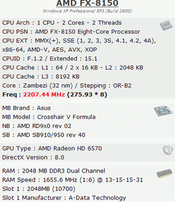 The author of this achievement was able to fix the memory mode DDR3-3311 . The only 2GB module worked with 13-15-15-31 timings. The frequency of the processor itself was reduced to 2207 MHz.