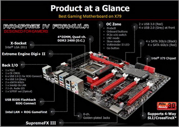 ROG Rampage IV Formula has four DDR3 2400 (OC) (maximum 32 GB), four PCIe 3.0 x16 and two PCIe 2.0 x1 slots, six ports USB 3.0, twelve ports USB 2.0, one slot for ROG Connect, part of motherboard includes a digital power system Extreme Engine DIGI + II .
