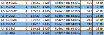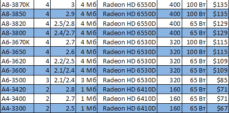 AMD presented the processors A8-3820 (2.5/2.8 GHz), A6-3620 (2.2/2.5 GHz) and A4-3420 (2.8 GHz). Their prices are not explicitly specified. Prices for other processors Socket FM1 have not changed.