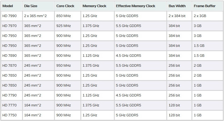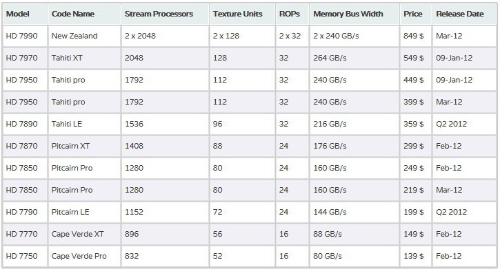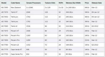 The Radeon HD 7950 will receive 1792 stream processors, 112 texture units and 32 units rasterization. Video card will operate at 900/5000 MHz frequencies, equipped with 3 GB GDDR5 memory with 384-bit bus. This option would cost $ 449. In March next year AMD company will release the Radeon HD 7950 with 1.5 GB GDDR5 memory, which will cost $ 399. Finally, in the second quarter may come Radeon HD 7890 - graphics card based on Tahiti with 1536 stream processors operating at frequencies 900/4500 MHz and equipped with 1.5 GB GDDR5 memory . The cost of this product would be $ 349. The Radeon HD 7890 will retain the 384-bit bus.