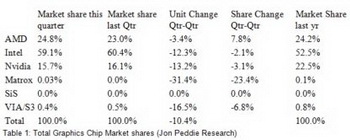 Intel has reduced its share in the graphics market from 60.4% to 59.1%. AMD's market share increased from 23% to 24.8%. NVIDIA has also lost to competitors, reducing the market share from 16.1% to 15.7%. By the way, its volume of sales decreased by 13.2%. The share of Matrox in the last quarter accounted for 0.03% of the market, VIA/S3 hold 0.4%.