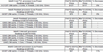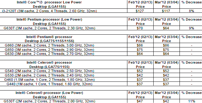 Intel reduced prices of three processors models LGA 1155: Core i3-2120T, Pentium G630T and Pentium G530T.