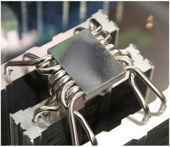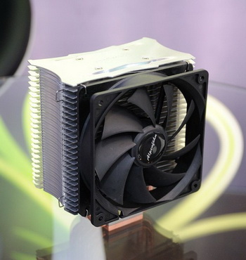 In addition, Alpenföhn presented Brocken prototype cooling system 2, which is a construction of two major sections, with aluminum fins, curved, grouped in six heat pipes. Â
