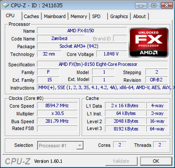 The Vietnamese leaders phattai, overclocked CPU to the frequency 8594.7 MHz . The Master took the motherboard ASUS Sabertooth 990FX, ASUS GeForce GTX 680 Direct CU II and RAM Kingston HyperX Genesis. CPU multiplier was set at the value 30.5x, the system bus - at 281.79 MHz and supply voltage was increased to 1.848 volts; of 8 active cores were only 2.