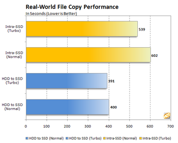 Note that in the synthetic tests, the speed gain from UAS does not look impressive, but the most significant increase seen in the benchmark CrystalDiskmark when working with random  data blocks of 4 KB and a queue depth of 32: