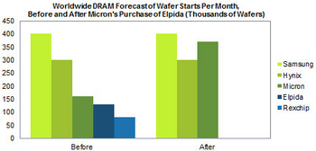 If Micron Buy Elpida it will increase the number of wafers produced on a monthly base ( DRAM chips ) from 160 to 370 000 units - more than twice. Micron will receive a 24.8% market share, slightly ahead of SK Hynix with 24.2% and second only to Samsung with 40.8% of the market.
