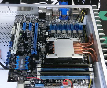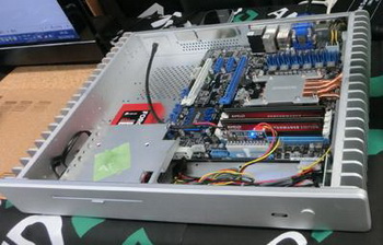 The processor is cooled by heat sink with four heat pipes that convert heat to the wall of aluminum case. Using an external power supply, the system can provide virtually silent operation.