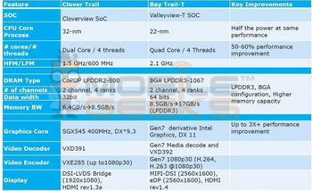 Increased battery life: from 9 to 11 hours of video playback, but, interestingly, in standby Bay-Trail-T will last only 20 days, while its predecessor for the same period has 30 days. However, Intel claims twice the performance per unit of energy used in the new SoC. Frequency of processor cores is increased to 2.1 GHz performance - by up to 60%.