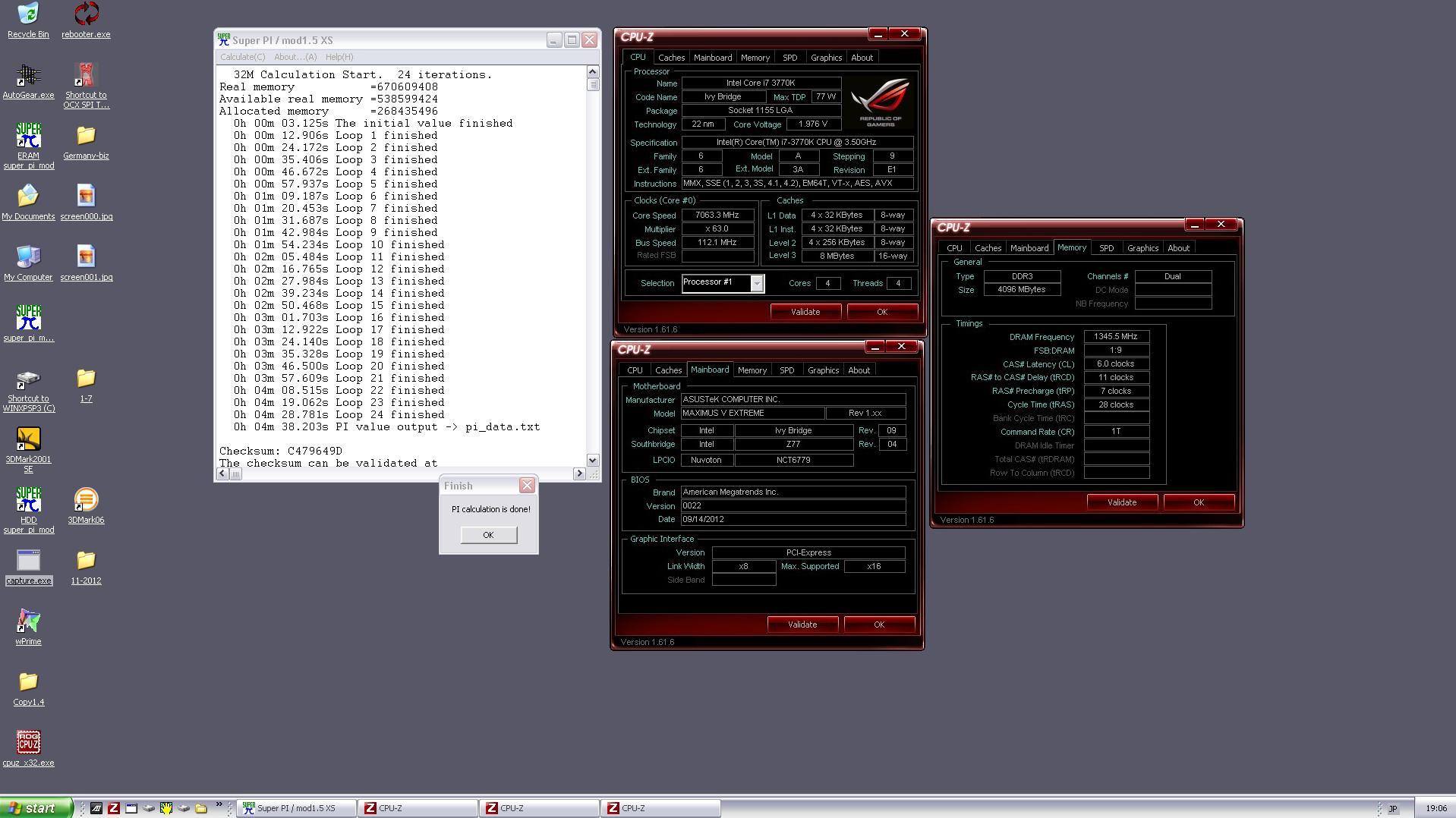 Andre posted some of the results in a row, the best of which is a time of 4 minutes 38,203 in Super Pi 32MB .  This impressive result was possible after overclocking Core i7-3770K to the frequency of 7063.3 MHz (63.0x 121.1 MHz, 1.975 volts, 4 cores active).  The memory was running at an effective frequency of 2691 MHz and timings of 6-11-7-28 T1.