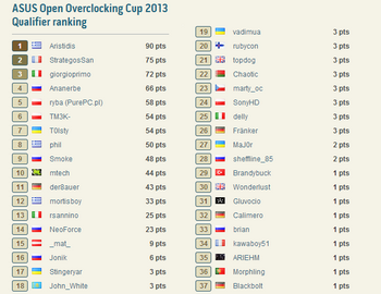 At the end of 2013 will meet AOOC 13 teams. Directly to the final winners of ASUS Open Overclocking Cup 2012  were invited - Perica_barii (Montenegro), and Xtreme Addict (Poland).  Another twelve teams :