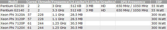 Obviously, the new items will soon begin to conquer the market. This concerns, first of all, models such as the Pentium G2030 and G2140 and Xeon Phi 3120A, 3120P, 7120P and 7120X. Processor Pentium G2030 will have lot numbers BX80637G2030 and BXC80637G2030, and its S-Spec - SR163. Pentium G2140 model correspond to lot numbers BX80637G2140 and BXC80637G2140, S-Spec - SR0YT. Processor numbers G2030T and G2120T missing from the list, but it is typical for solutions with the letter T, which are not available in boxed versions.