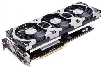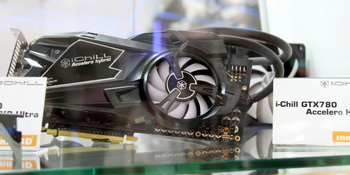Also Inno3D showed GeForce GTX 780 model with the cooling system HerculeZ X3 Ultra. For this card inside the system case there are at least three expansion slots. Cooler combines a large two-piece radiator on the base of five heatpipes and three fans, framed decorative casing with removable metal inserts.