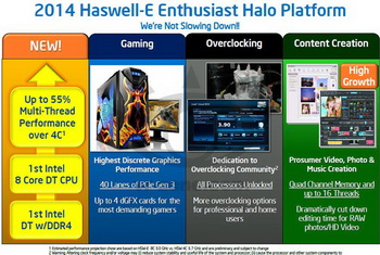 The platform Haswell-E will be announced in the second half of 2013 - Ivy Bridge-E processors in LGA 2011. It is intended for enthusiasts and overclockers, who will not have restrictions for overclocking. But in this case, Intel limited to minor improvements. For example, the number of cores will be completely frozen at number 6, so it will go down in 2014. The first 8-core desktop processors, will appear in the second half of 2014 as a model for the LGA 2011 platform Haswell-E.