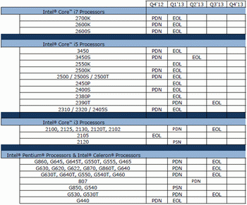 For the majority of Sandy Bridge processors withdraw program started , the production and delivery of solutions Core i7 and Core i5 were terminated in the first quarter of 2013. In the next three months, Intel will also end the supply lines on younger - Core i3, Pentium and Celeron.