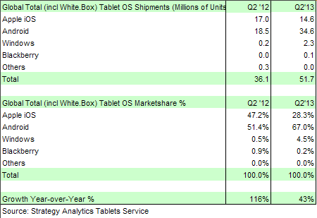 According to Strategy Analytics, in the second quarter this year, were sold 51.7 million tablets, of which 36.2 million units belonged to the products of famous brands. This is more than a 43% and 47%, respectively, from a year earlier. In other words, the growth rate of special tablet sales are still ahead of their unnamed neighbors. Tablets running Android took 67% of the market versus 51.4% a year earlier.