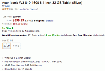 The announcement of the coming new version Iconia W3, and lower Microsoft pricing  simply allowed Acer to reduce the price,  the tablet can be bought in U.S. stores for $ 299 instead of $ 379.  For this money, the buyer gets a tablet with 32GB  solid state memory, the 64 GB version will cost $ 349.