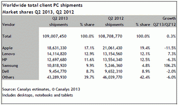 Following the procedure of Canalys, taking into account the sale of the tablet together with statistics on desktops and laptops, the largest computer manufacturer is Apple company, even though it passed the position compared to the second quarter last year. Lenovo takes second place, showing steady progress in all areas. In particular, the company was able to sell on the world market more than a half million tablets - previously a similar result seemed unattainable. Lenovo tablets are selling well in China and Latin America - here the same products Google or Amazon, through official channels just does not fit.