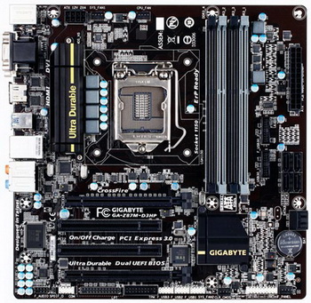 Gigabyte GA-Z87M-D3HP has four power system, also available 24-pin ATX connector and 8-pin connector EPS. The motherboard is equipped with four slots with dual channel DDR3-3000 memory (up to 32GB) slots PCI Express 3.0 x16 and PCI-E 2.0 x4 (support the possibility of constructing chords AMD CrossFireX as follows: x16 + x4). Also available two PCI, six SATA 6 Gb / s controller with RAID-arrays levels 0, 1, 5 and 10, two 6-pin connector USB 3.0, Ethernet controller, and 7.1-channel audio codec Realtek.