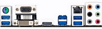 On the back panel there are six ports USB 3.0, one RJ-45, combo PS / 2 (mouse or keyboard), DVI-D, D-Sub and HDMI video outputs, as well as six 3.5-mm audio connector Mini-Jack.