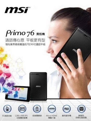 MSI is preparing to release its new tablet computer models Primo 76. The device has a rugged metal case with the dimensions: 196 x 121 x 9,5 mm, weight - 360 grams, received a 7-inch IPS-display with 1280 x 800 resolution .