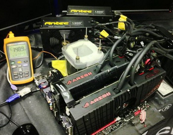 Slamms Smoke used two rare dual the HD 7970 X2 series Ares in the motherboard Asus Rampage IV Extreme paired with the Core i7-4960X they were overclocked to 1200/7000 MHz using a default cooling. True, the CPU was clocked under liquid nitrogen to 5675 MHz, but it is quite predictable. At this frequency engineering sample processor retained the activity of all six cores and Hyper-Threading.