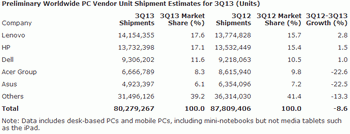 Gartner and IDC, find out that PC in the third quarter was the only good places and it is not for everyone.  Gartner counted for the quarter  80.3 million new systems sold, and IDC - 81,6 million estimated first year for the PC market declined by 8.6%, according to the second - 7.6 %.  On the one hand, analysts were expecting the worst - of falling sales at the level of 9,5% (IDC).