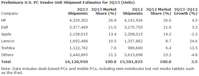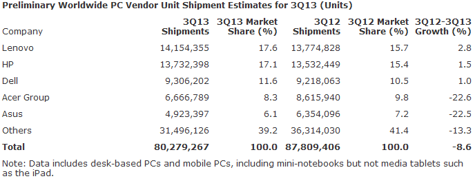 If we talk about brands, the top spot hold Lenovo.  HP has fallen behind . The first own 17.6%  , the second - 17.1%.   During the year Lenovo increased its quarterly sales by 2.8%, while HP and Dell for the year also grew by 1.5%, respectively, at 1%.