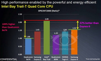 This image illustrates the advantage of a yet unknown processor Bay Trail-T over competing solutions. Interestingly, the opponents chosen are - NVIDIA Tegra 5 and Samsung Exynos 6.