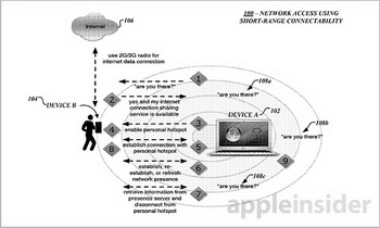 Apple brought new patent applications for the registration of a document called Network access using short-range connectability.  This document is submitted for registration May 1, 2012 and is already close to approval.  According to Apple proposal  , personal devices such as smart phones and other mobile electronics may have a cellular modem to work with  Internet, but in case of detection in range of the network, as they say low-power communications, the device is automatically included in the network of low-consumption and work with the global network services as usual.  As an example, LPC-networks patent is standard Bluetooth, which refers to 11 years ago.