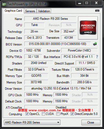 GPU-Z utility detects the video card as Radeon R9 280X with 2048 stream processors, 3GB of GDDR5 memory and 384-bit bus, the default frequencies are 1000/6000 MHz.