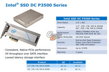 P3700 and P3500 series are replaced by series S3700 and S3500, shown in the summer and autumn of last year. And if the previous server series (except 910) were made in the form factor 2.5 inch Interface SATA 6 Gb / s, the drives P3700 and P3500 series will be based solely on the PCI Express interface in two form factors: 2.5-inch and form an expansion card.
