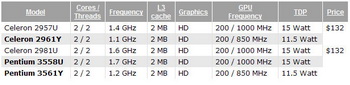 Model Celeron 2961Y and Pentium 3561Y in accordance with its letter index are 11.5-watt TDP. However, the core frequency are reduced to 1.1 GHz and 1.2 GHz. Related Products :