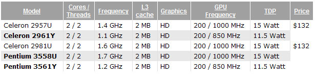 In October, we reported that Intel is preparing to start a new versions of low-power mobile processors Haswell generation . The list included such models as the Celeron 2957U and 2981U, and Pentium 3558U and 3561Y. Their main feature had to be support to technology such as wireless video transmission - Wireless Display (WiDi).