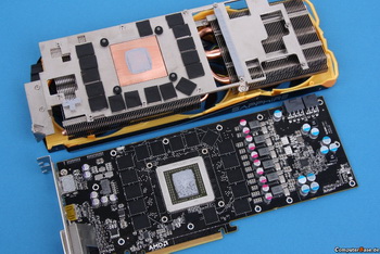 Circuit board in Radeon R9 290 Tri-X OC has a reference design. Â In the factory, the GPU of this card is increased up to 1 GHz, it does not change even after heating. Â In the standard version under load frequency ranges 700-920 MHz, 947 MHz, although stated.