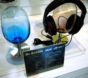 Cases computer manufacturer InWin presented an interesting device called Mr.Bubble.  Designed for Asus product series Republic of Gamers, it is an elongated glass bubble on an aluminum stand for storing headphones.