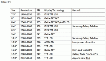 Diversity along the diagonals and types of tablets matrices: OLED, IPS, IGZO.  Few, however, goes much further beyond 300 dots per inch, which is not bad at all.  After all, increasing the resolution has a negative side - the high consumption of both display and GPU SoC.