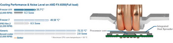 As reported by the developers, the construction of the cooler and the fan was so optimized for airflow and heat rejection, similar to that in the Freezer 7 Pro modes they provide an opportunity to reduce the CPU temperature by about 10 degrees Celsius. The noise level is also low.