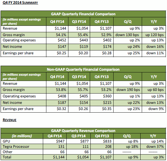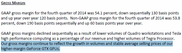 Just note that the proceeds from the sale GeForce GTX increased by only 50% compared with the fourth quarter of 2012, compared to the quarterly trend was more modest.  NVIDIA representatives repeatedly stressed that the mass popularity of video card declined along with the demand for computers.  What part of these cards is named GeForce GTX, not specified.  What we see on the transition from the third to the fourth quarter?  Total revenues grew by 9%, the profit rate declined.  That is, the company began to sell more products with lower price.  What NVIDIA explains the reduction rate of return in this case?  Decreased sales Quadro and Tesla, which have higher margins and increasing share in the structure of core Tegra products affecting revenues.  Not a word about the growing popularity of cheap video cards, it was only an opposite trend.