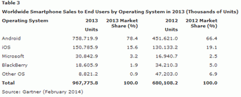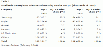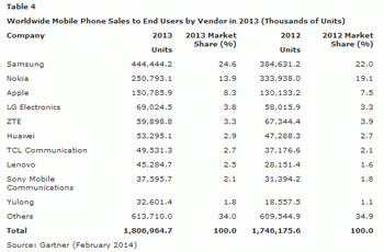 Analyst firm Gartner has once again summed up the work of manufacturers of smartphones in the fourth quarter of 2013 and for the year as a whole. In short, the share of smartphones in the fourth quarter was 57.6% of all cars sold in this period for cellular devices. . Smartphones also won the first annual event. In 2013, was sold 968 million smartphones, which is 42.3% more compared with 2012. Total annual performance even share among all smartphone devices for mobile communication reached 53.6%. In other words, for the first time smart phones have come to dominate the market.
