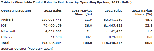 As calculated specialists Gartner, in 2013 of 195.4 million customers dispersed tablets, a 68% increase compared with 2012. In the table below you can see the distribution of market shares between the major operating systems. In short we can say that the percentage of tablets with iOS fell to 36%, although in the fourth quarter saw a spike in sales of tablets from Apple. In the first place last year went devices running Android with the current market share of 62%. This also means that the market is filled by inexpensive tablets with small diagonal screens.