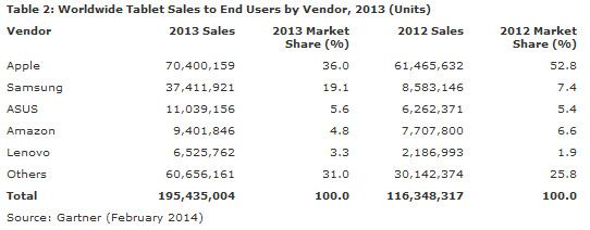 In the previous two months all companies had to report on the work in the fourth quarter of 2013 and in general for the whole calendar 2013. Received official data allow analysts to clarify the sales volumes for the previous reporting period. Below we will give information about the state of the tablet market in 2013 in terms of Gartner.