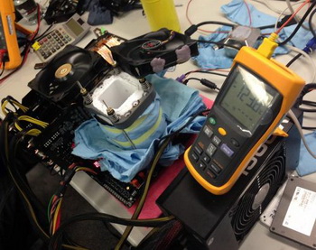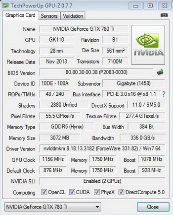 Pair of GeForce GTX 780 Ti has been overclocked to 1156/7000 MHz, Core i7-4770K was clocked at 6.4 GHz , which is cooled with liquid nitrogen.